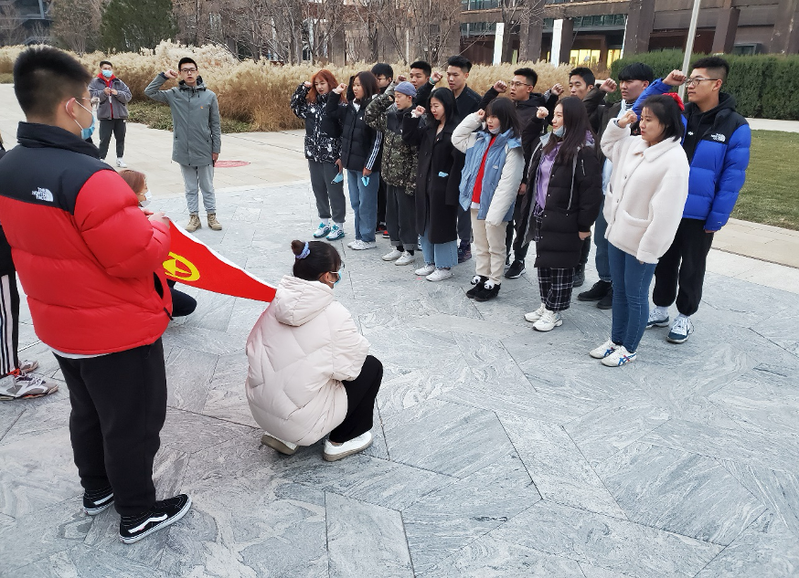 随后马老师带领大家走进冬奥办公园区,感受首钢工业遗存与奥林匹克精神融合所焕发的勃勃生机。在园区里全体团员面向团旗庄严地重温了入团誓词。